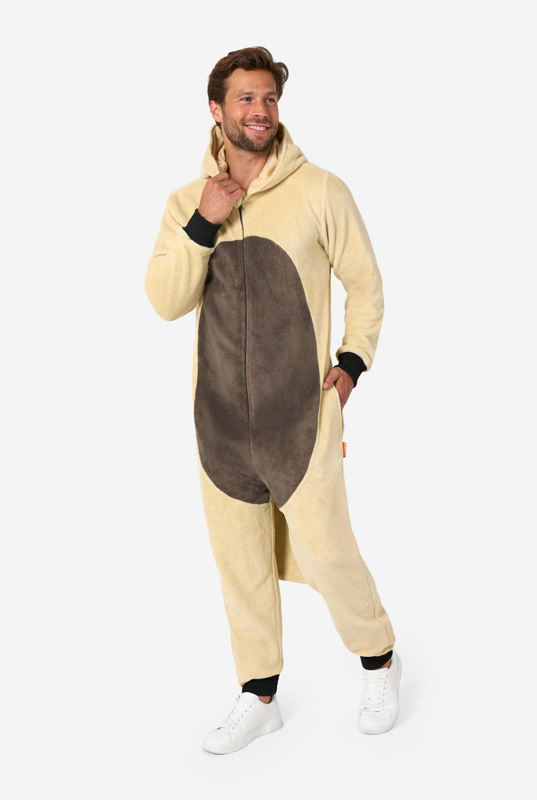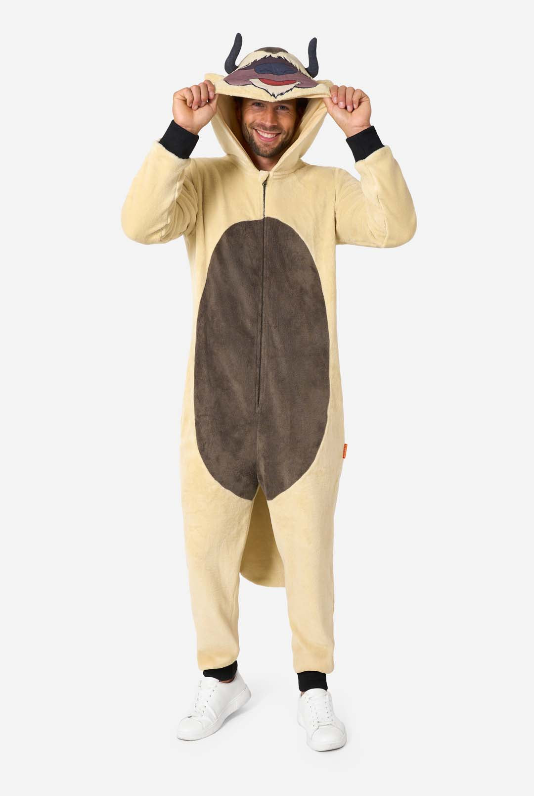• Man wearing a beige and brown fleece Appa onesie with hood featuring Appa’s face, horns, and brown belly patch.