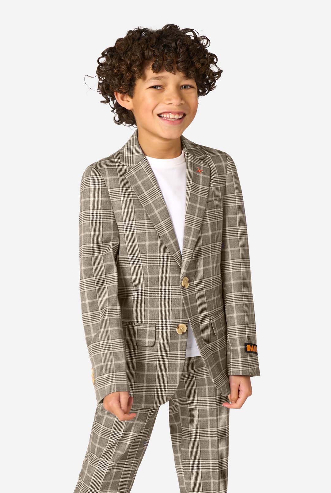 • A boy wearing a tan checkered suit with a white dress shirt. The suit has a modern fit with two buttons and flap pockets. He stands against a plain white background.