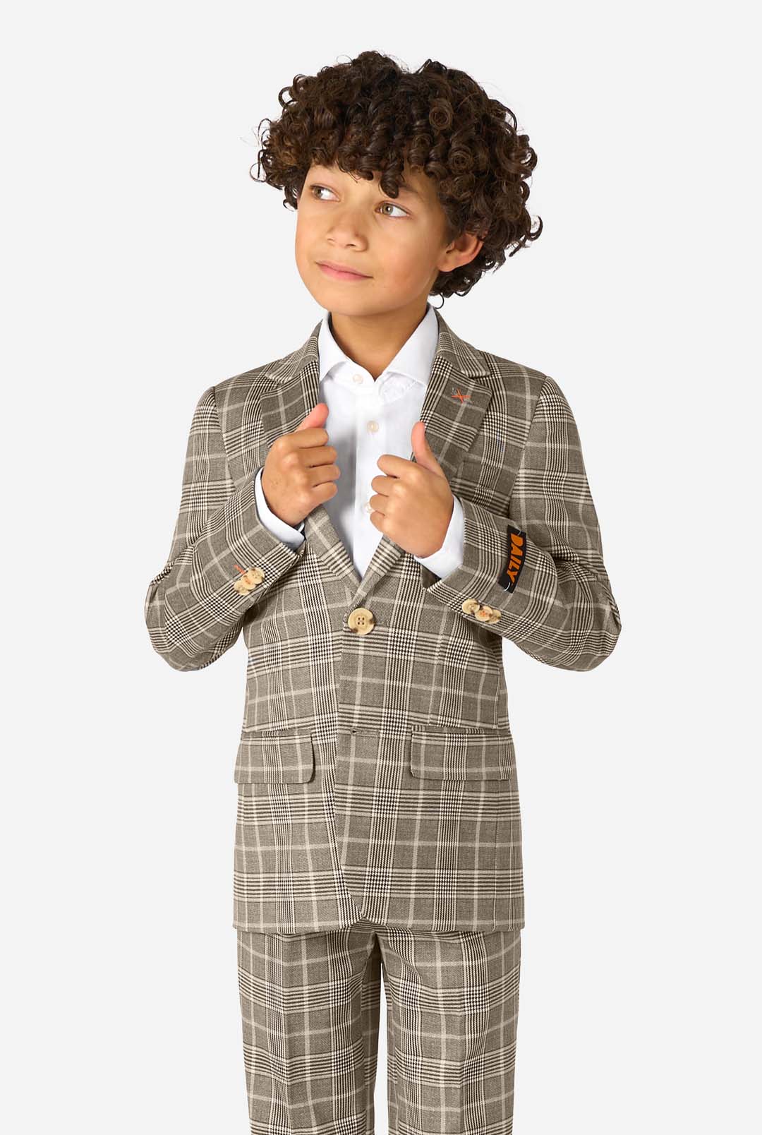 • A boy wearing a tan checkered suit with a white dress shirt. The suit has a modern fit with two buttons and flap pockets. He stands against a plain white background. Holding one side of the jacket open.