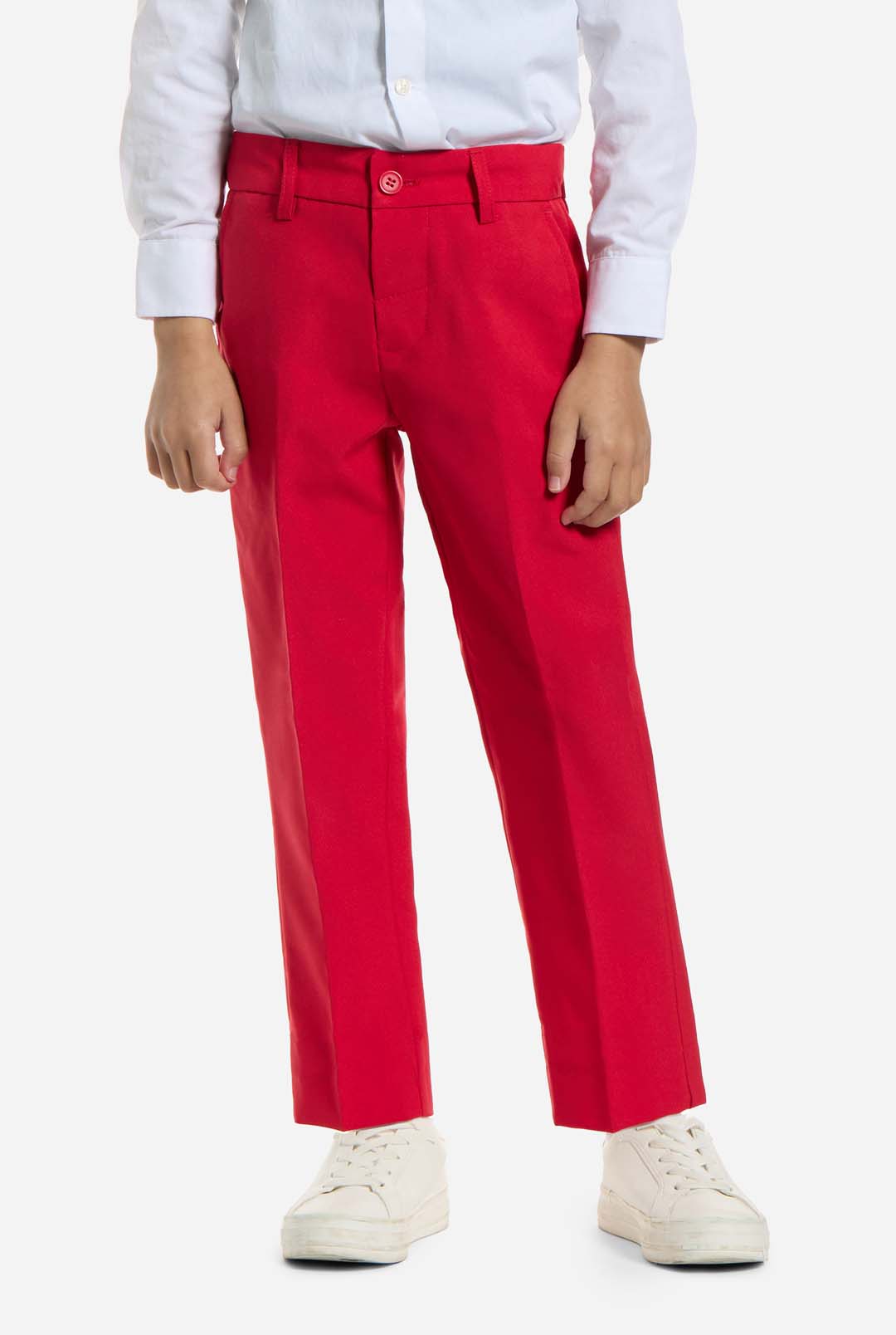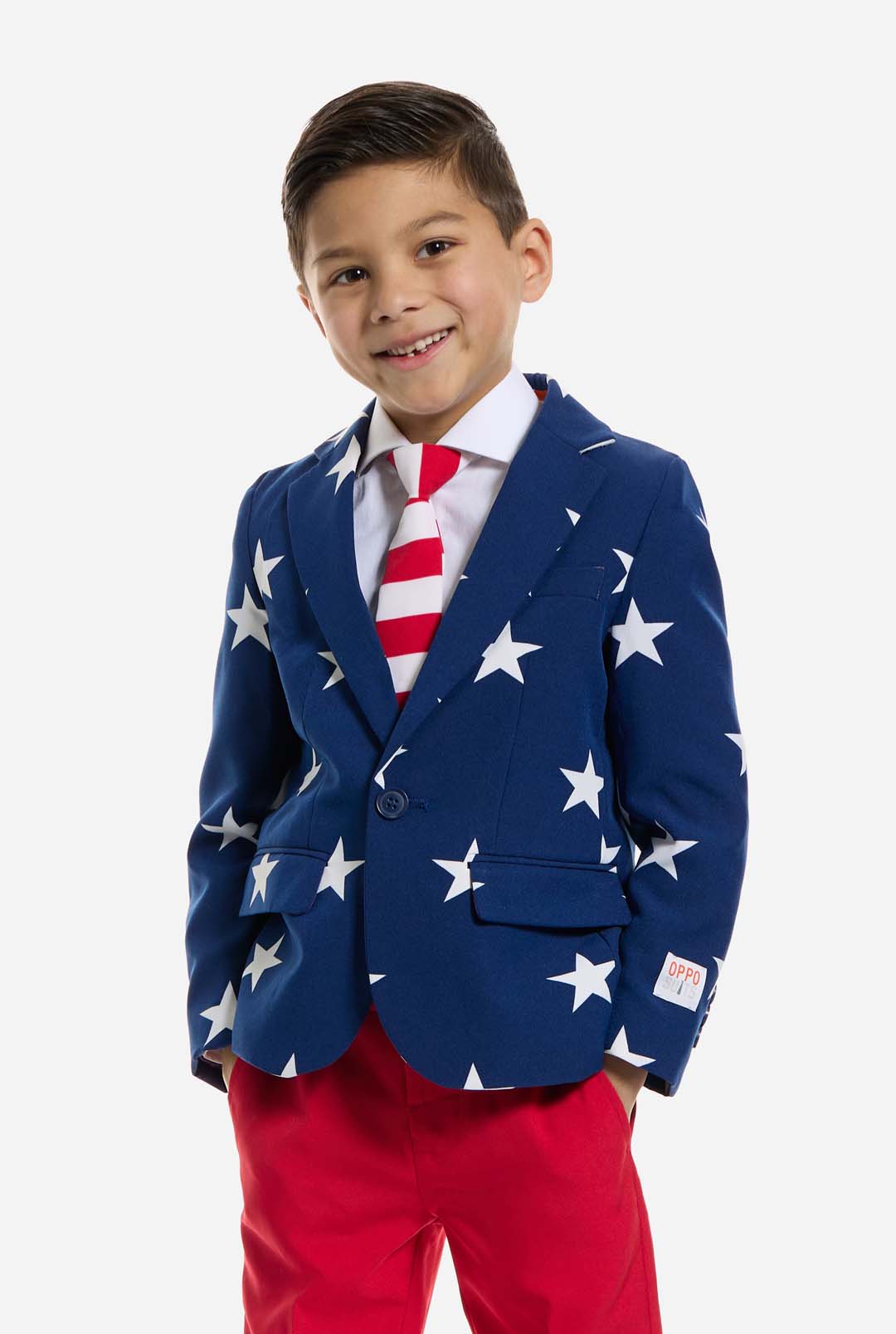 Teen wearing formal USA themed fourth of July suit, consisting of blue jacket and red pants.