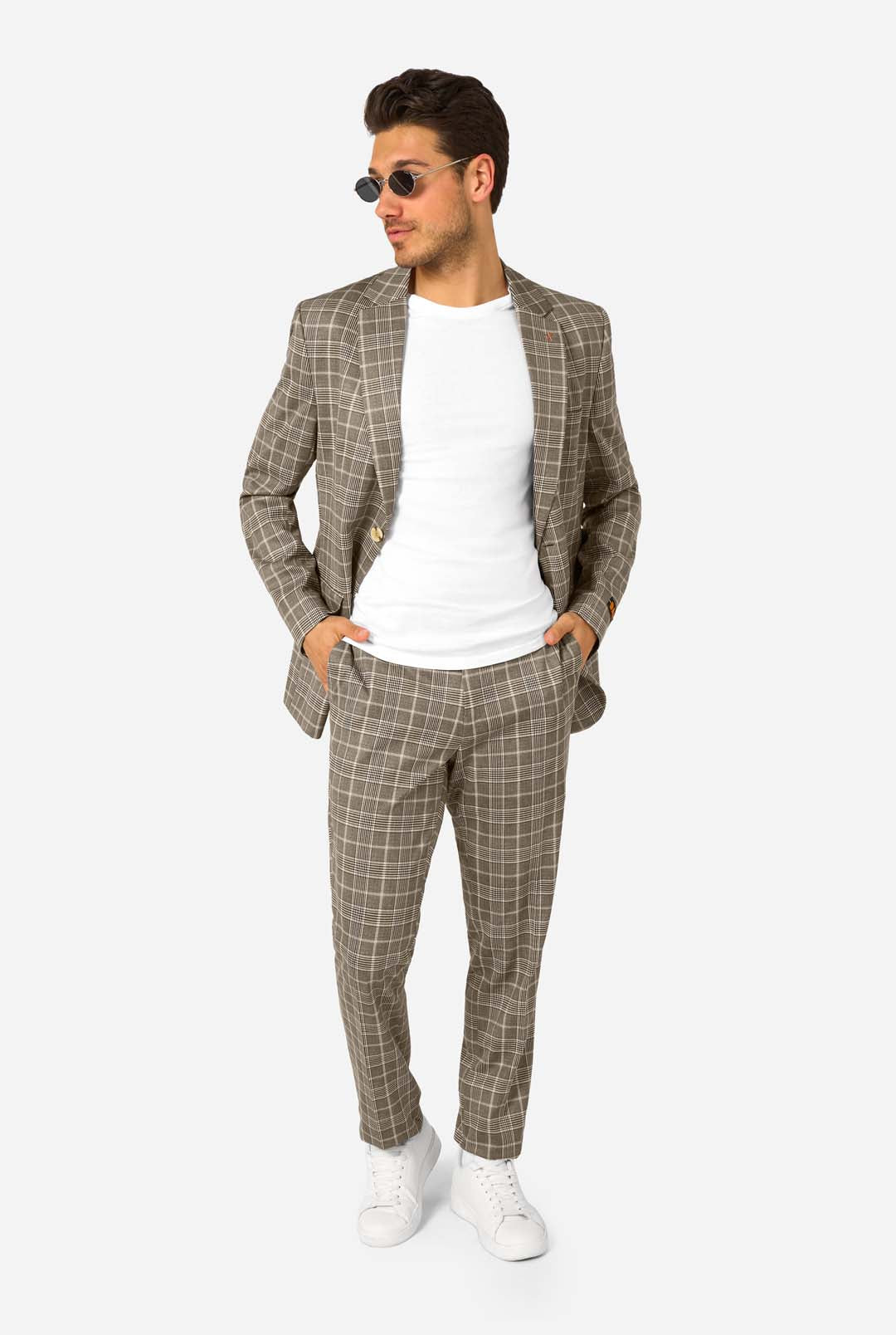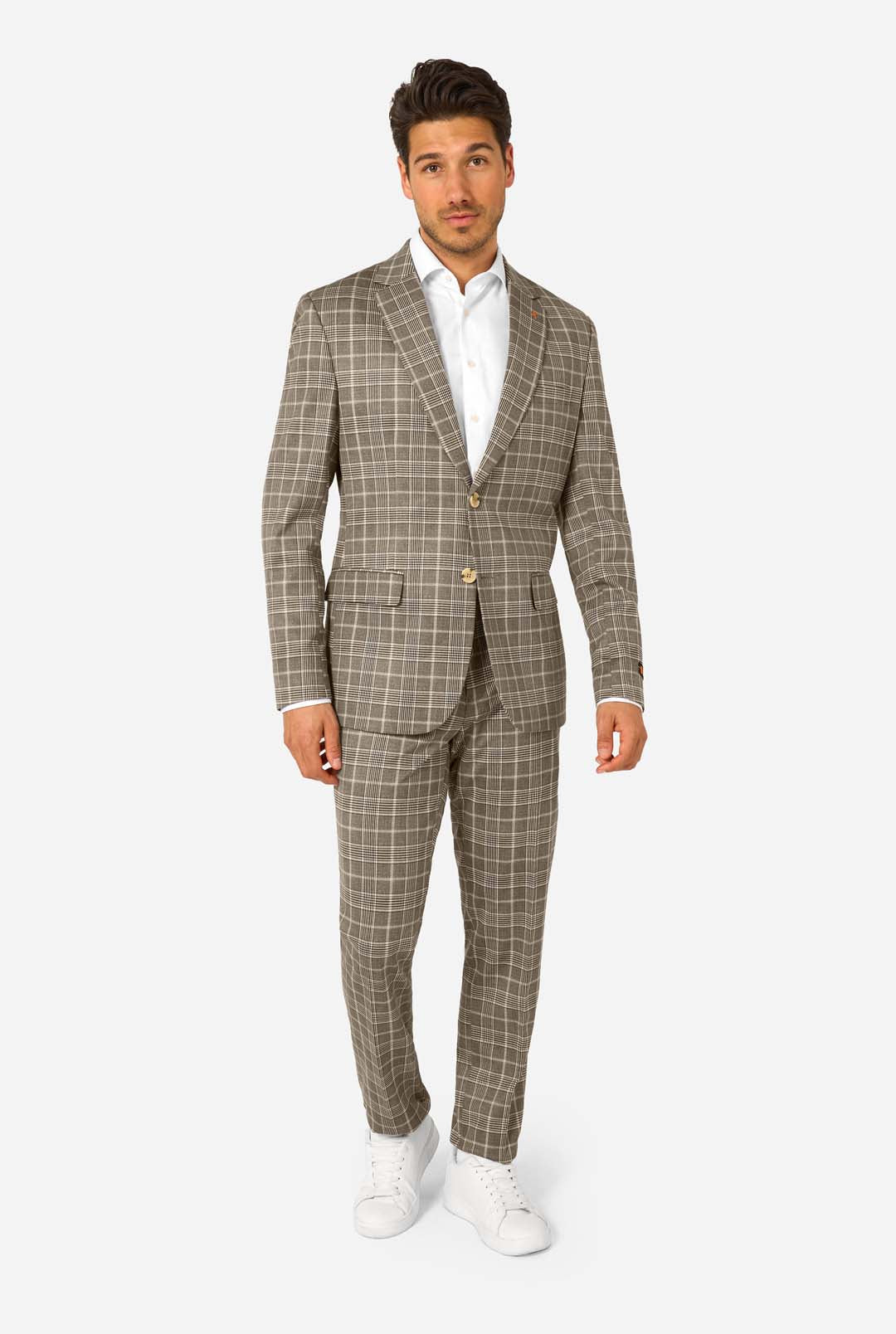 • A men wearing a tan checkered suit with a white dress shirt. The suit has a modern fit with two buttons and flap pockets. He stands against a plain white background. Full body image