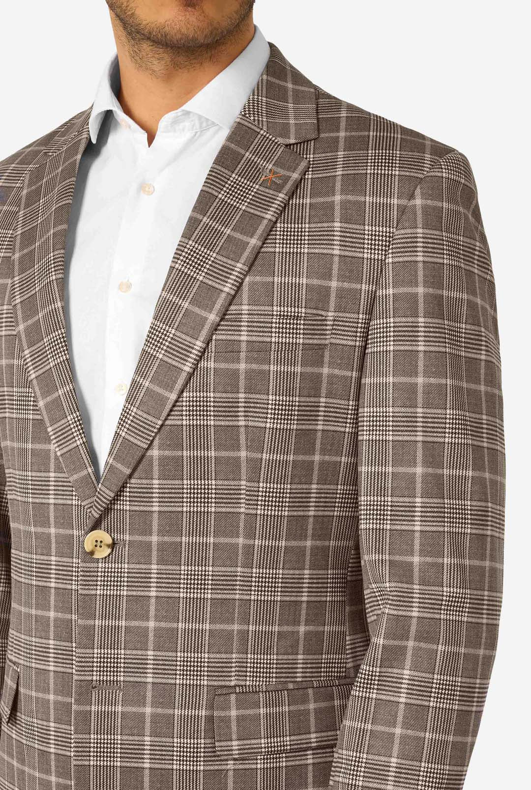 • A men wearing a tan checkered suit with a white dress shirt. The suit has a modern fit with two buttons and flap pockets. He stands against a plain white background. Close up of the sleeves