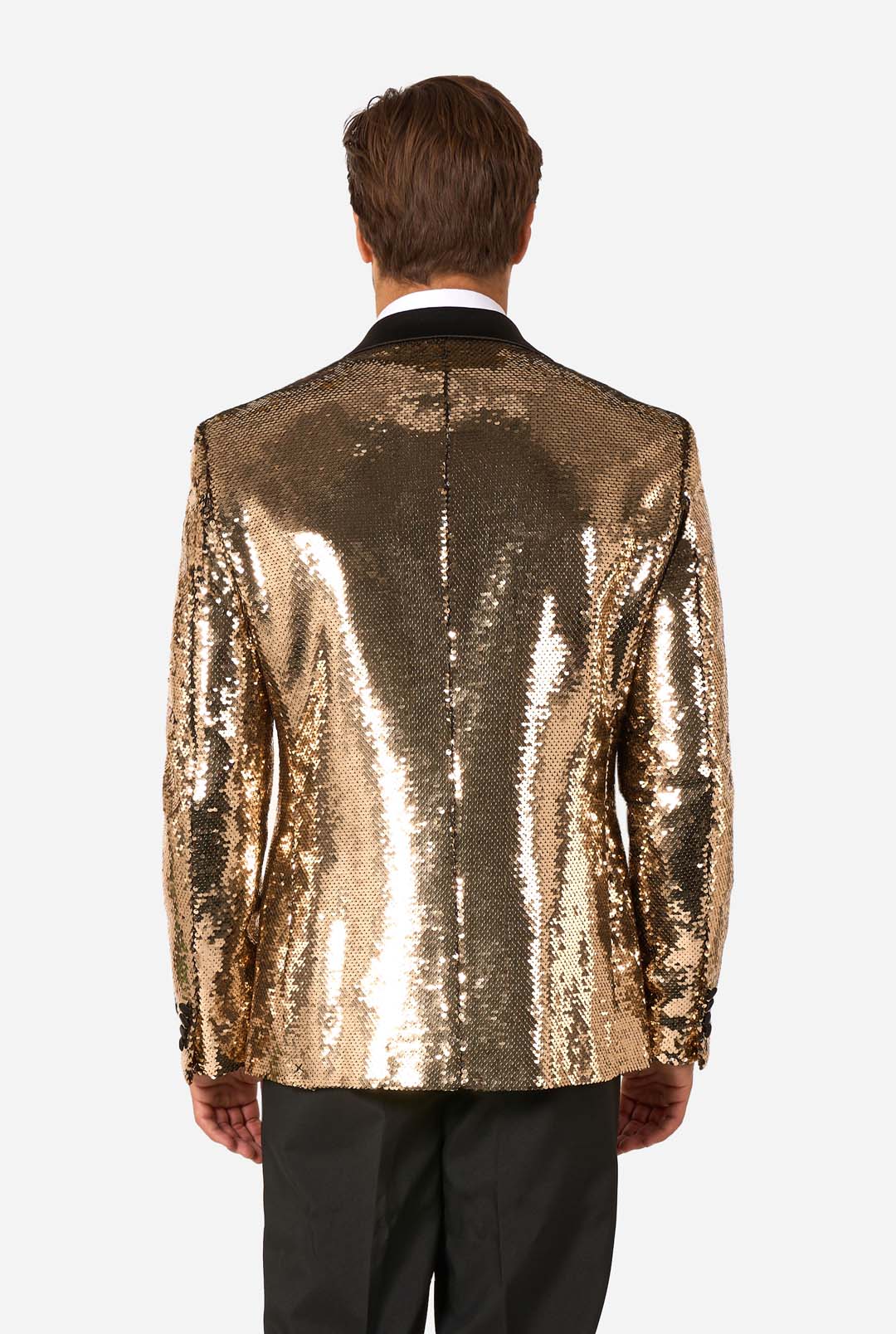 • Gold sequin tuxedo jacket with black lapels on a white background