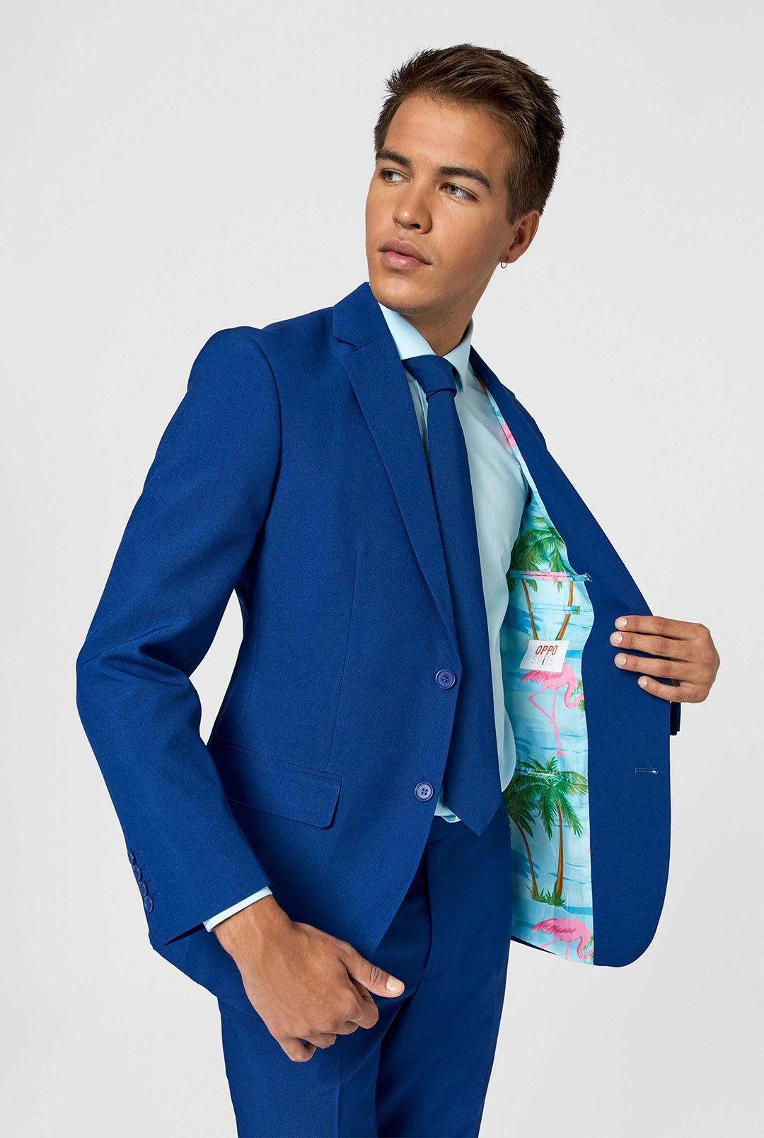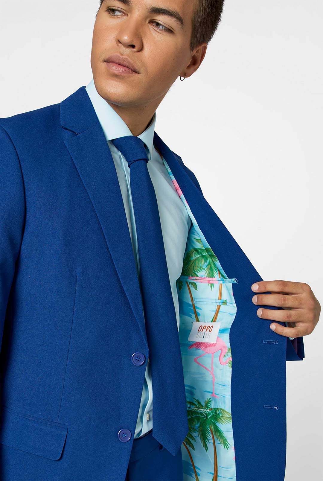 • Close up dark blue men's suit with multicolor lining with flamingos worn by man