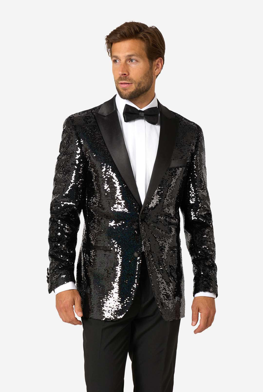 • Man in a black sequin tuxedo holding it open to reveal a plain black interior lining with an OppoSuits label.