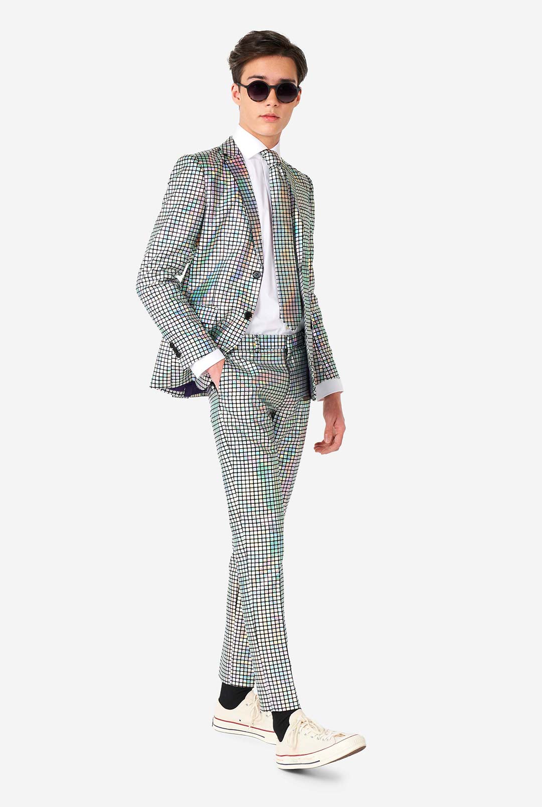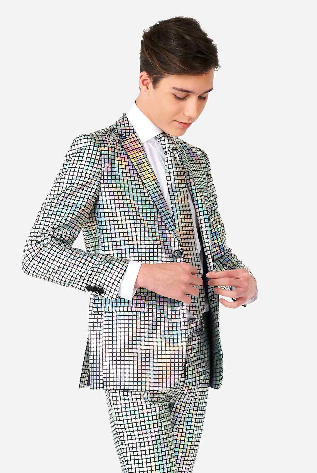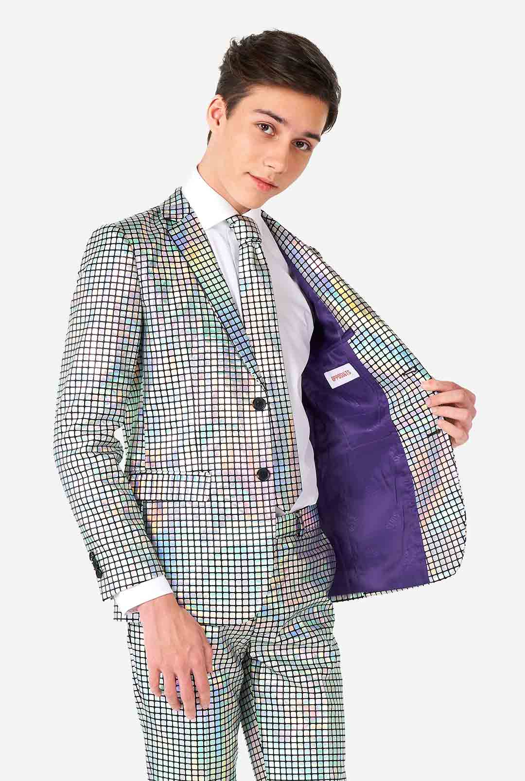 Burn baby burn… Disco inferno! This dazzling mirror patches suit is an absolute crowd favorite. Do you have the moves and the groove to wear it with respect to the sound of disco? Wear it to your next school dance and everyone will keep dancing around you all night long.