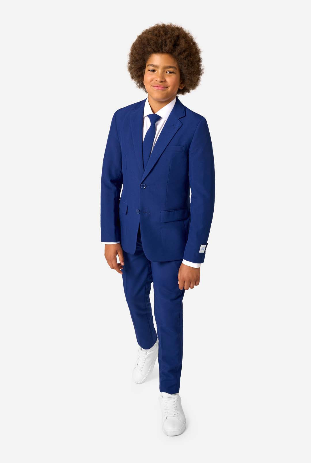 • Kid wearing a navy blue suit with a white shirt and tie on a light gray background.