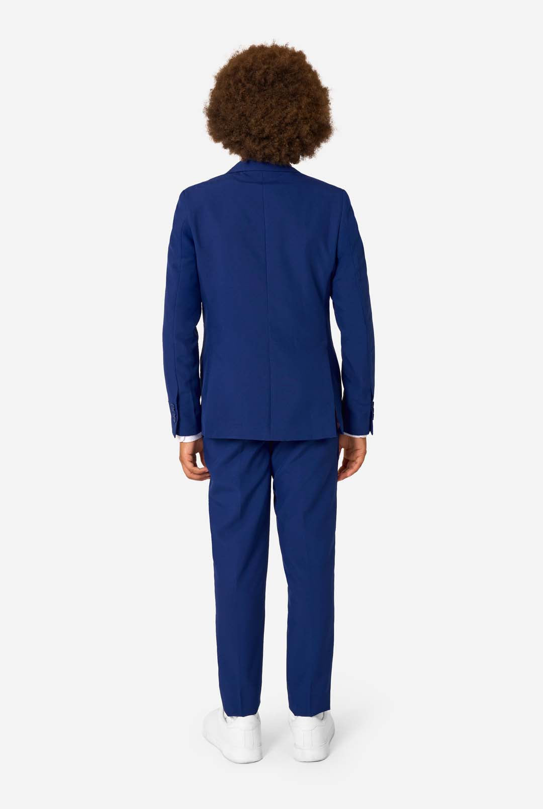 • Kid wearing a blue suit standing against a white background, view from the back.