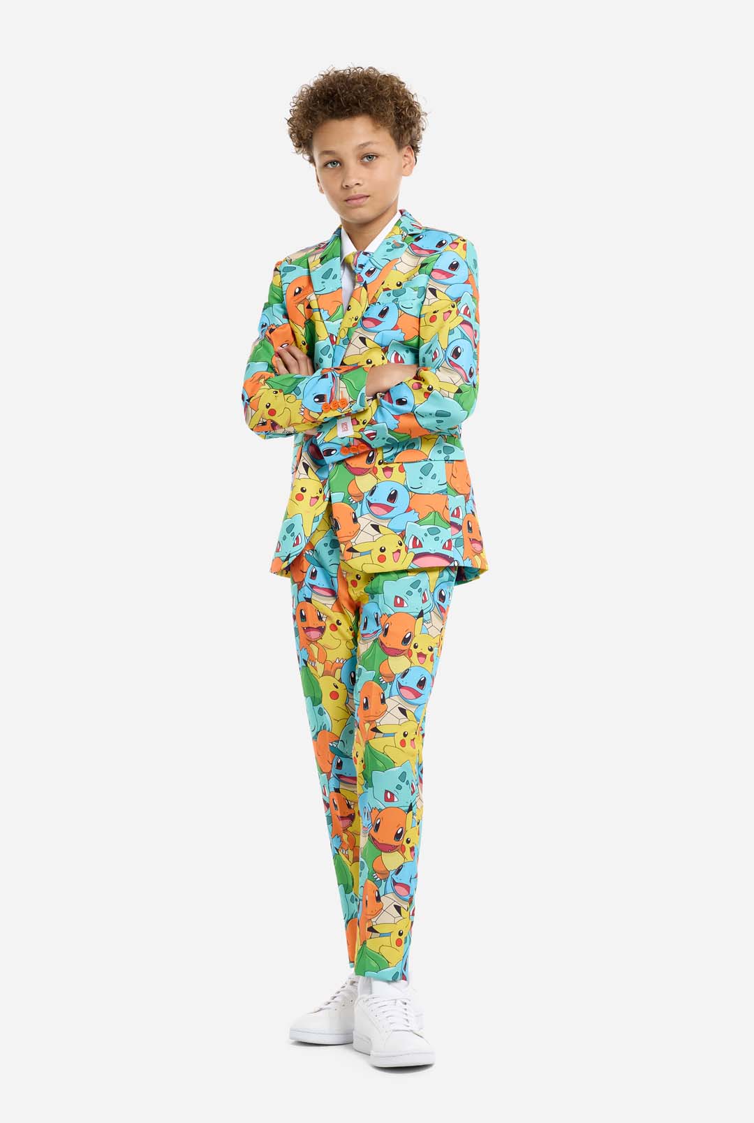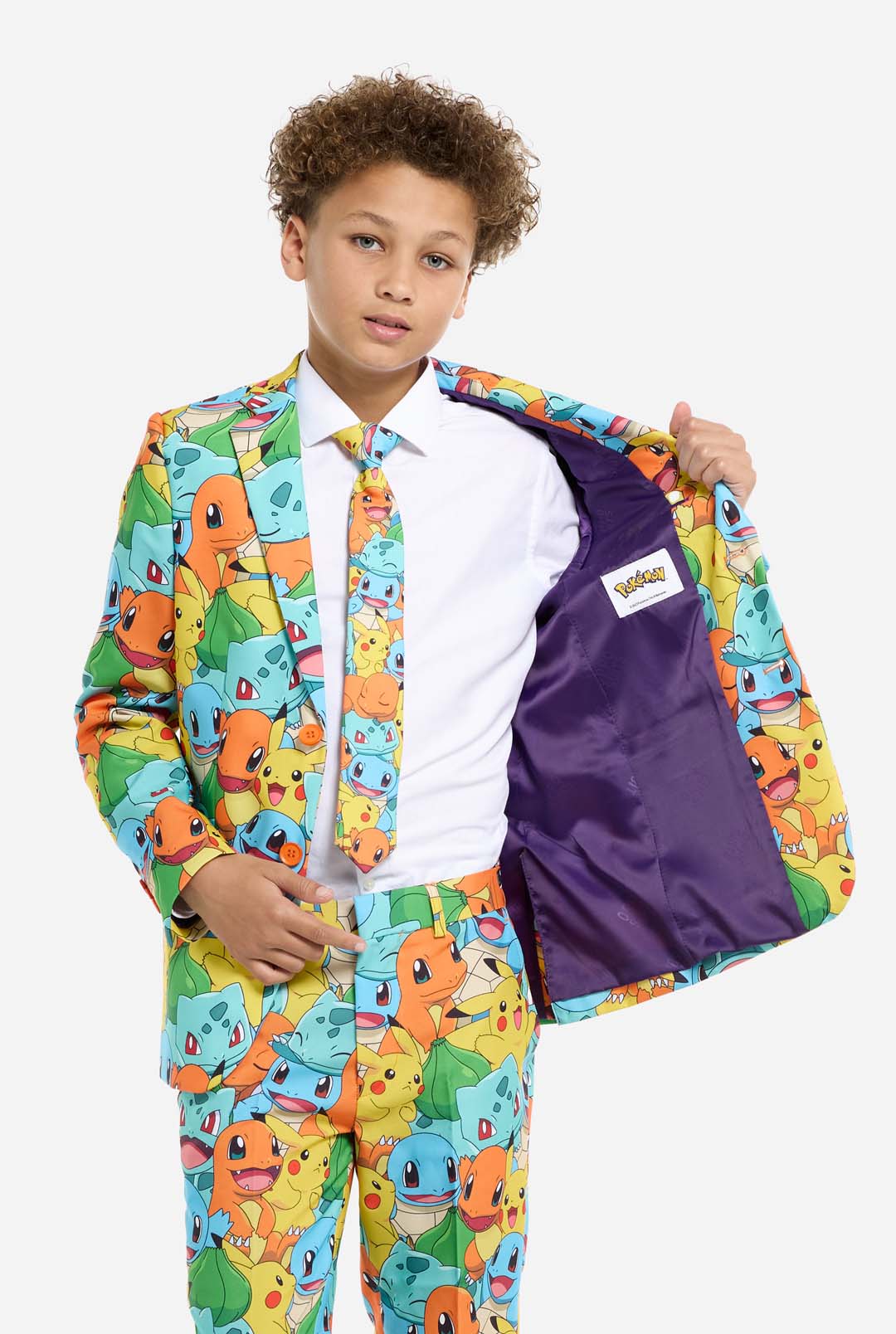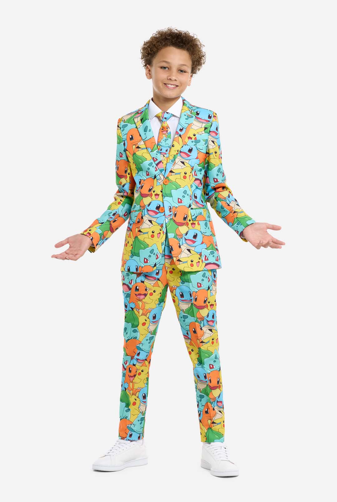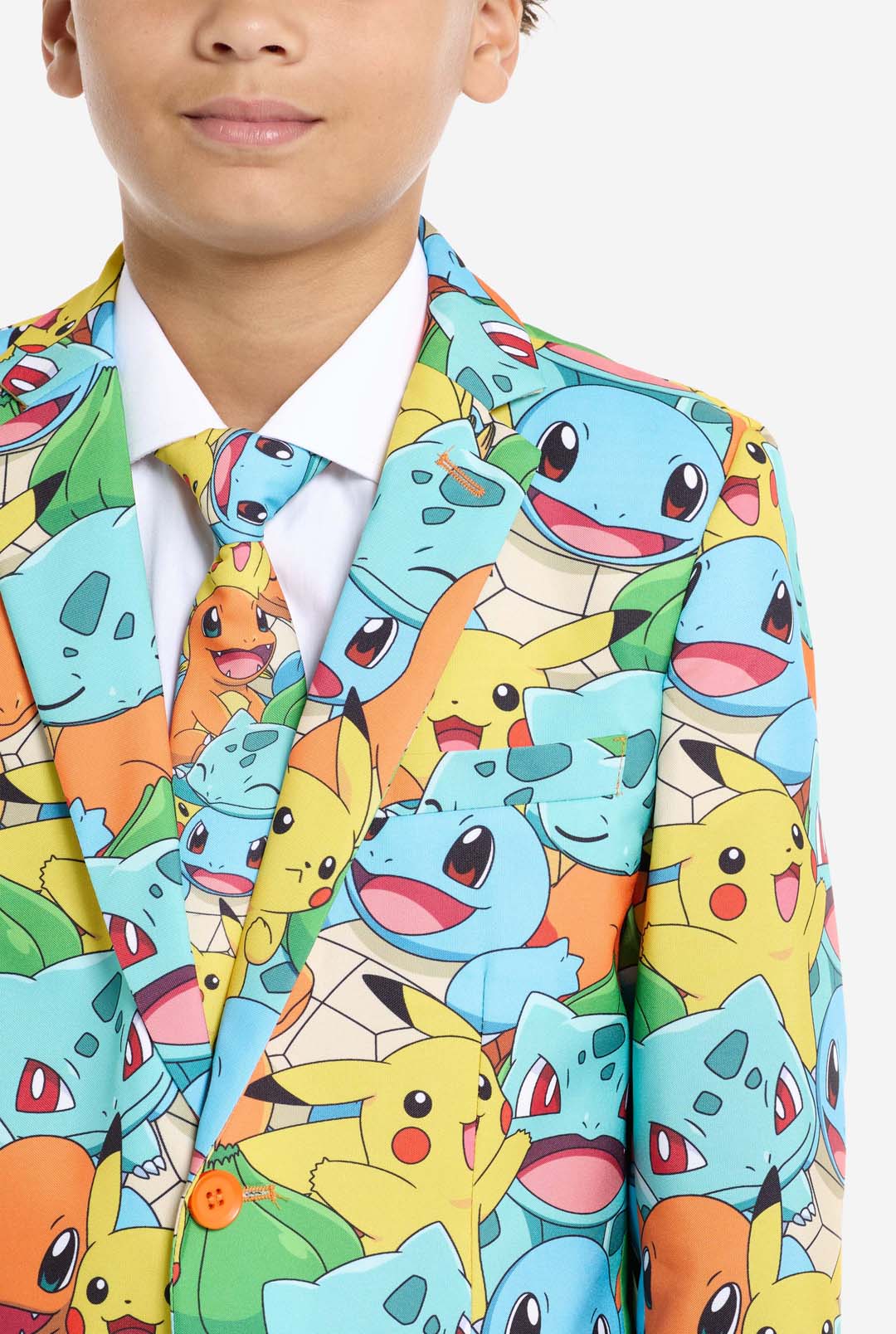As a true Pokémon Trainer, it is important to set out on your journey prepared. This includes your partner Pokémon, a Pokédex and... the right attire! Become the ultimate Pokémon Trainer with this all-over printed suit featuring the iconic Pikachu, Bulbasaur, Charmander, and Squirtle. We Choose You!