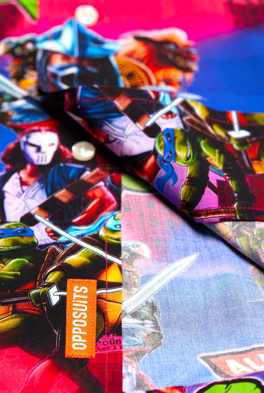 Kick back TMNT-style in this Movie Poster Hawaiian shirt. Pizza, poolside, and pure retro vibes, cowabunga!